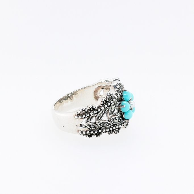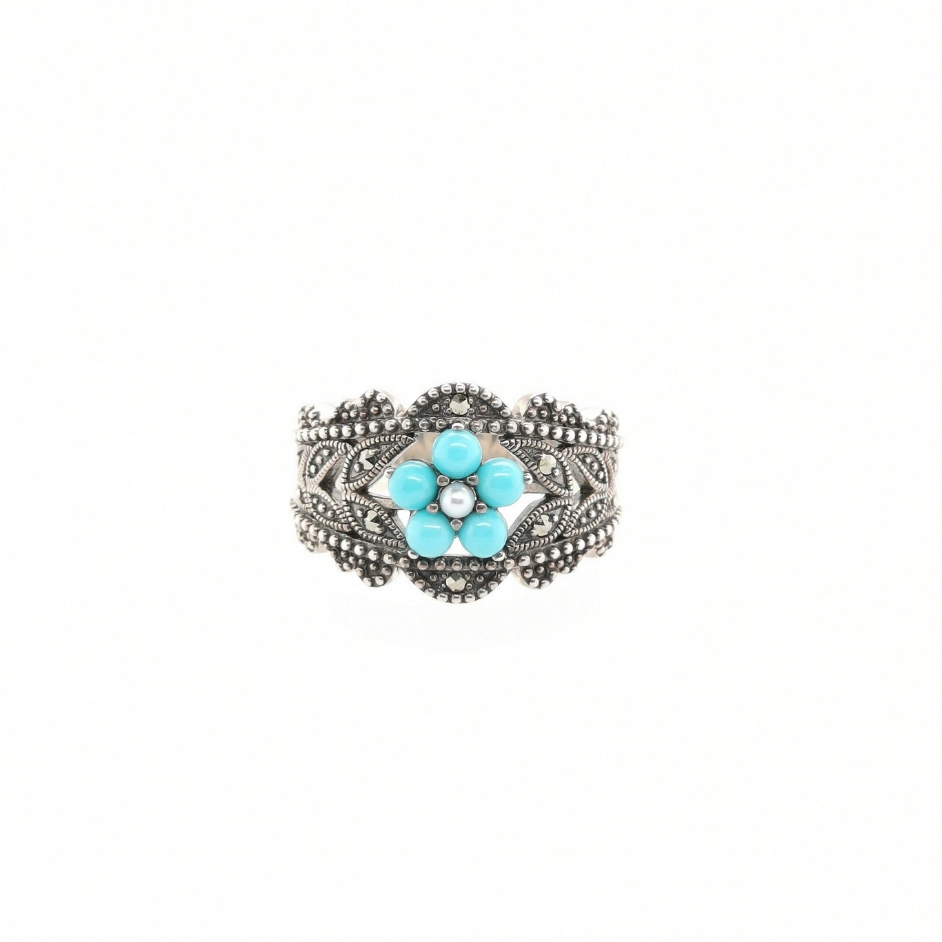 トルコ石で爽やかでかわいらしい花を形つくりました。フェミニンな印象ながら、マルカジットを花の周りに散りばめたことにより少し大人な印象のリングになりました。