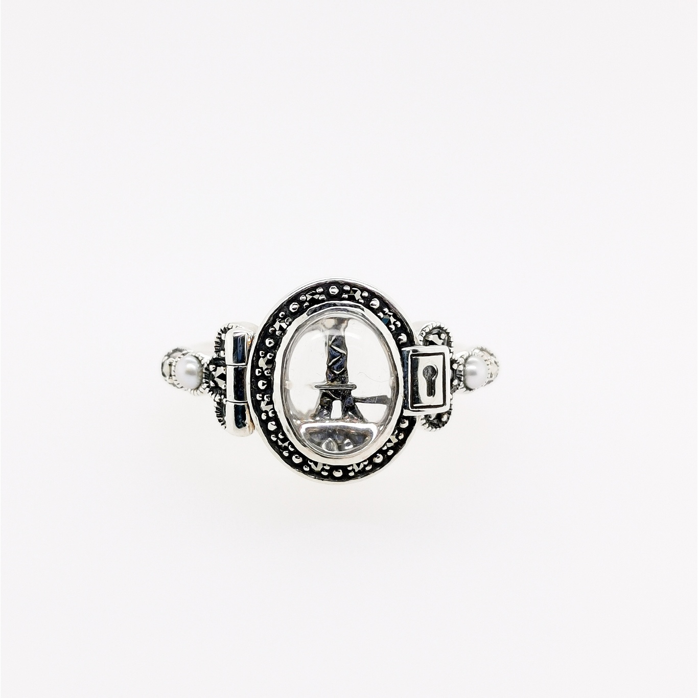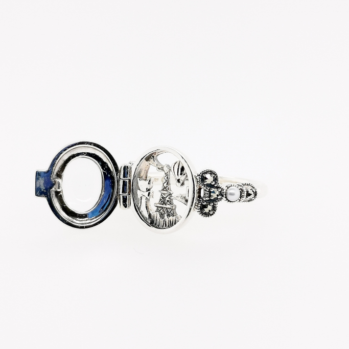 クリスタルの窓が開くロケットタイプのリングというこだわりのつくりが魅力です。窓にカットしたクリスタル、エッフェル塔の見える景色、窓辺の猫、腕の細かなデザインやシードパールなど、職人の息吹を感じる細部までこだわった作りこみをお楽しみください。