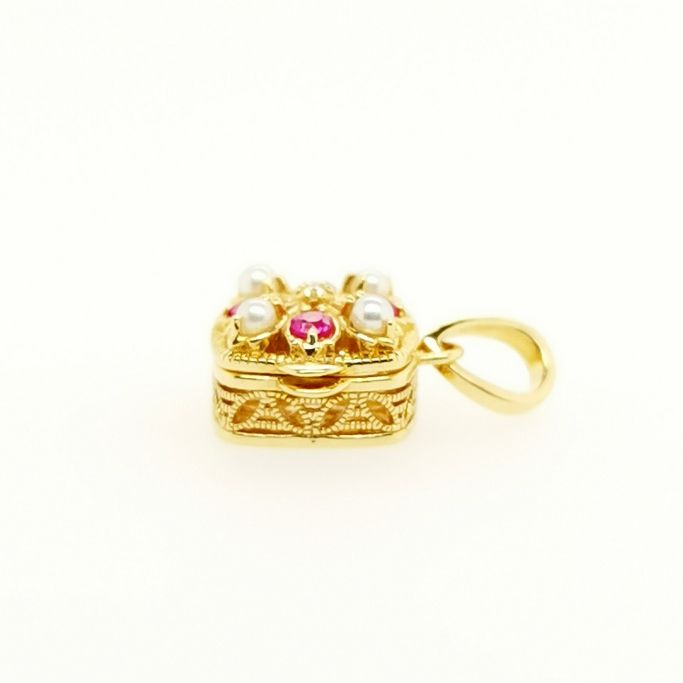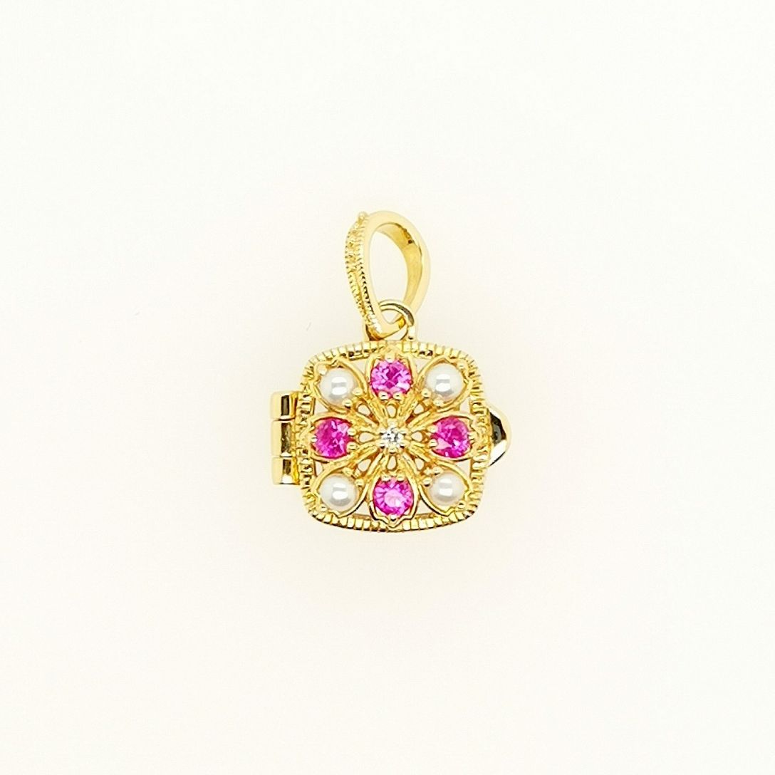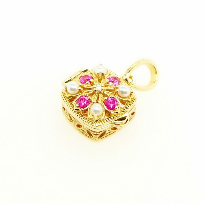 上面が開閉する可愛いペンダント。トップはセンターにダイヤモンド、そしてルビーとシードパールで飾りました。すかし細工が美しく、フレグランスをしみこませたコットンを入れても素敵です。
