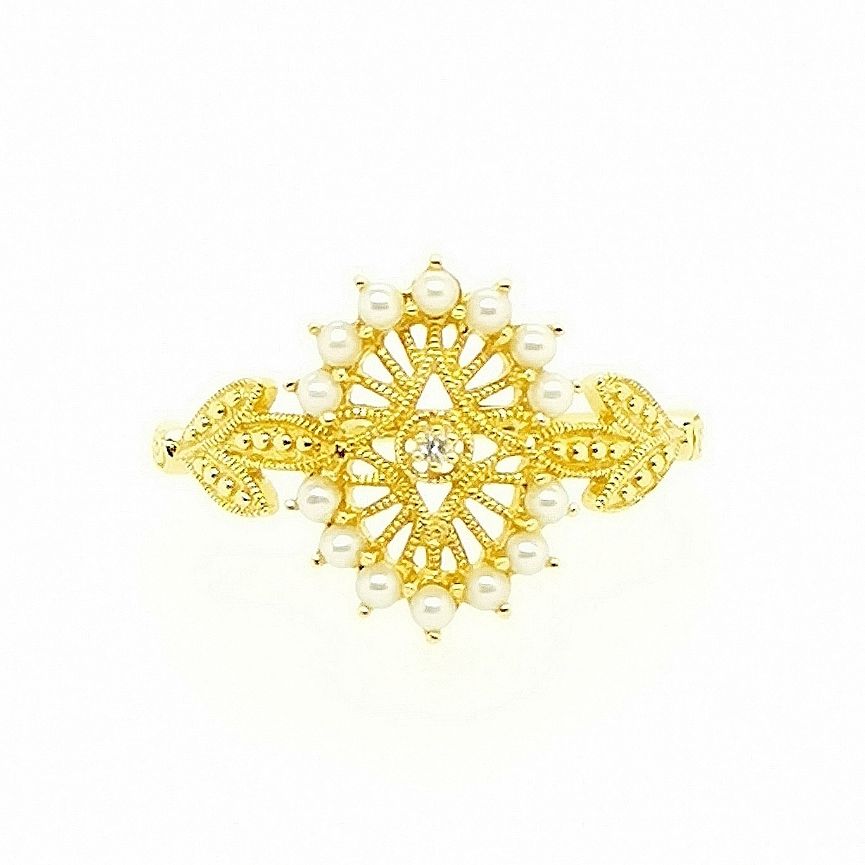 ミル打ちで仕上げたすかし模様をシードパールで取り巻きました。腕には花綱飾りとも呼ばれるガーランドスタイルのデザインを合わせミル打ちと玉飾りで仕上げています。