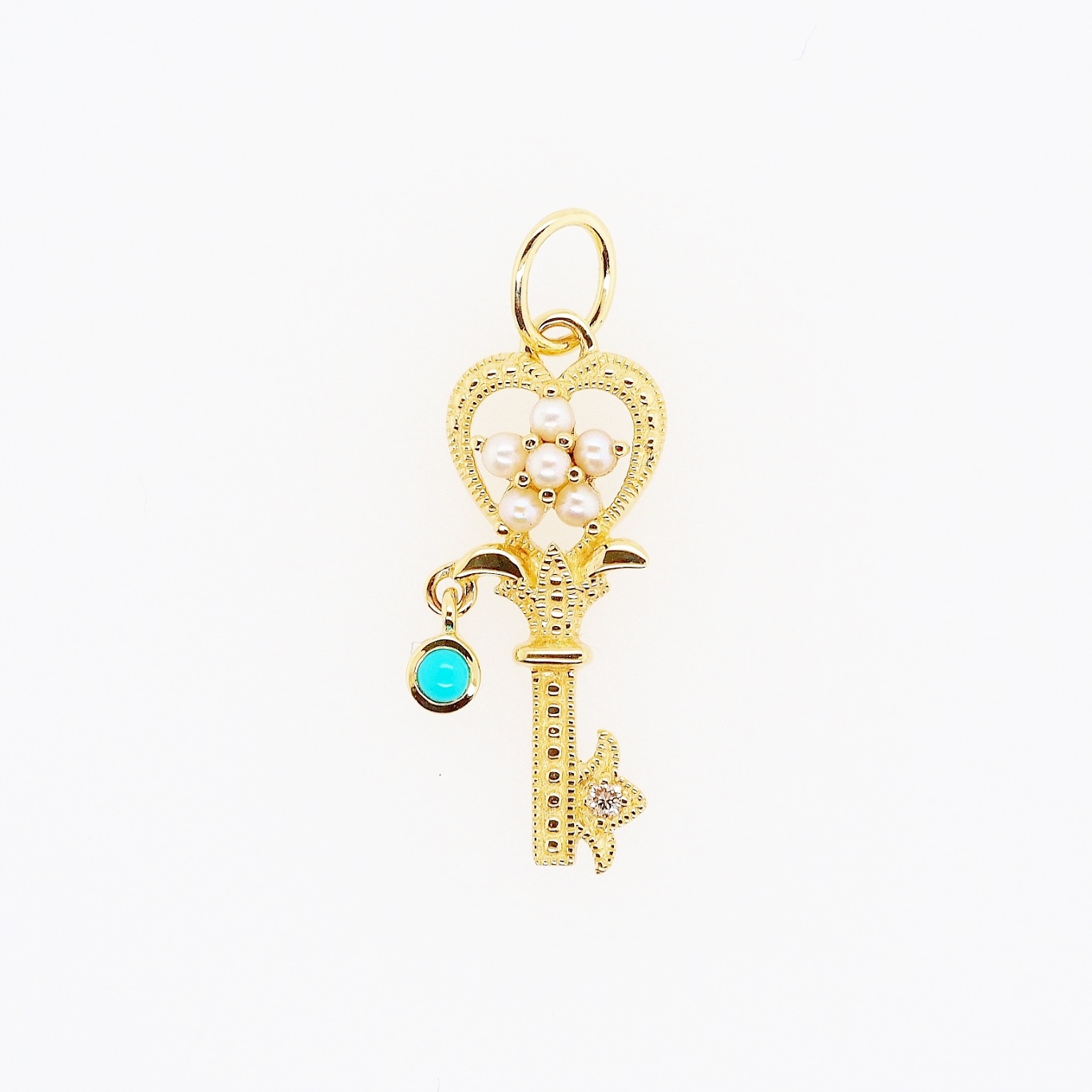 シードパールのお花で飾った鍵からトルコ石がゆれる可愛いペンダント。トップはハートのモチーフ、ミル打ちをふんだんに使ったアンティーク仕上のきらめきや鍵の部分はゆりの紋章を思わせる細かなデザインが素敵です。
