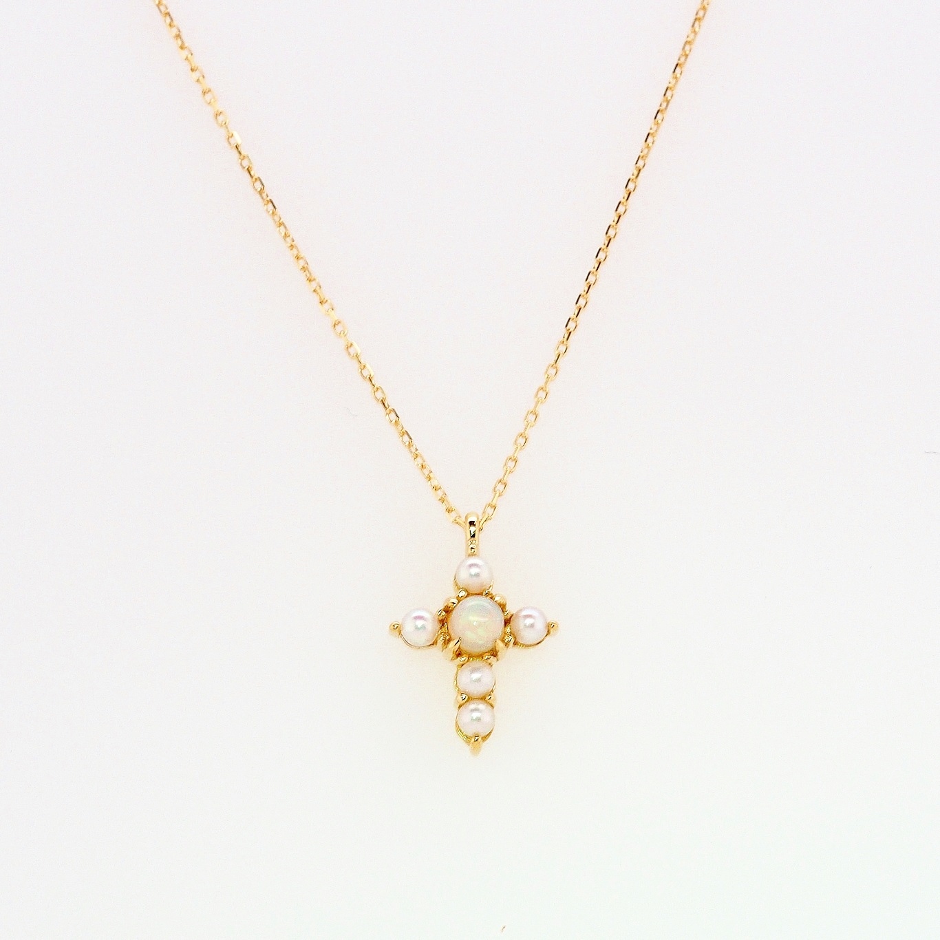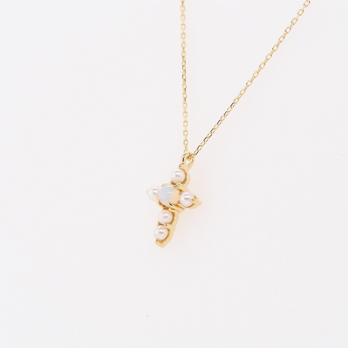アンティークの技法を再現した爪留めで留めたシードパールのクロス。センターにはオパールが虹色に輝きます。