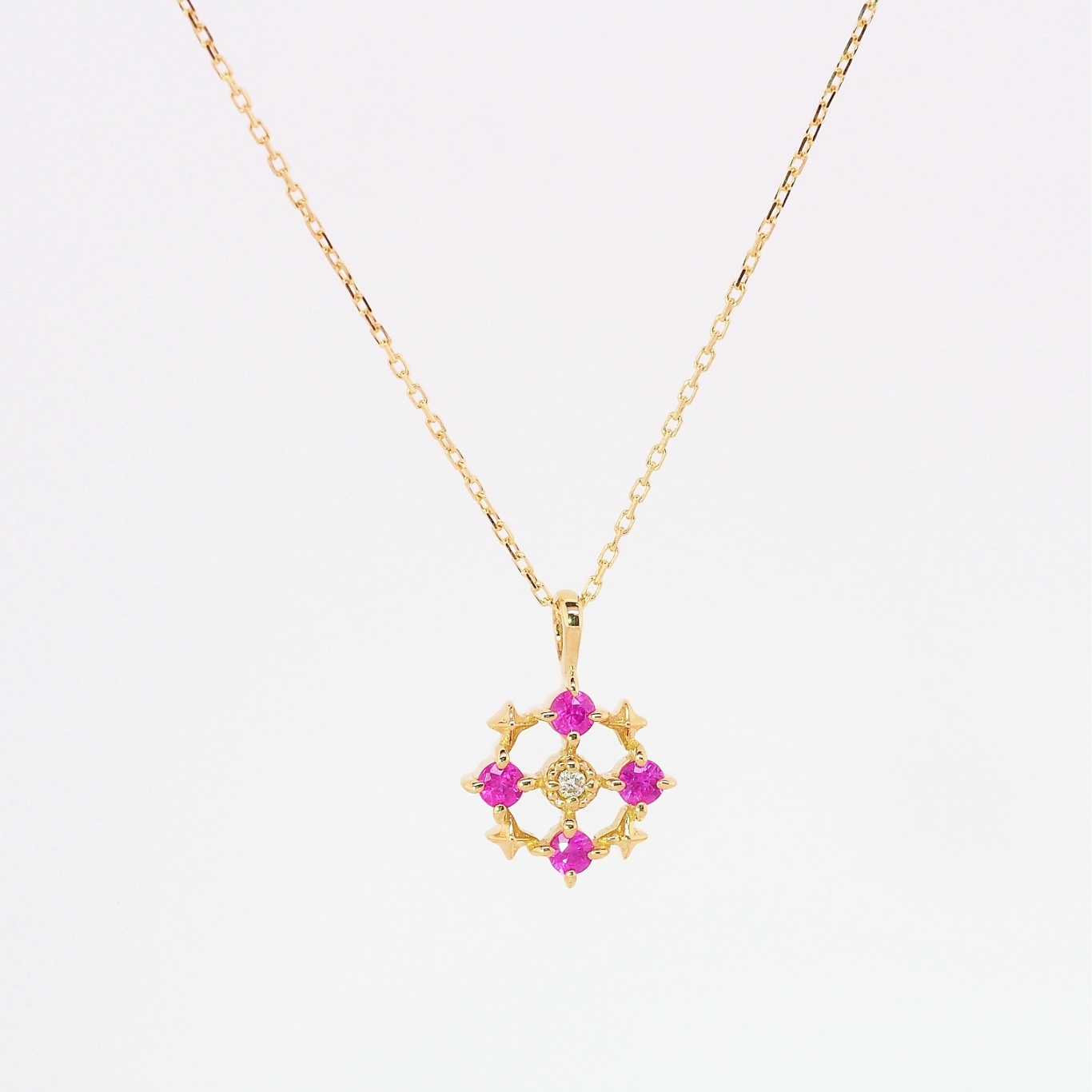 センターにダイヤモンドをアンティークらしいミル打ちで留めその周りをスター&ルビーでデザイン、お花のような軽やかな作りが魅力です。