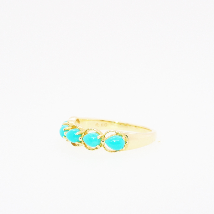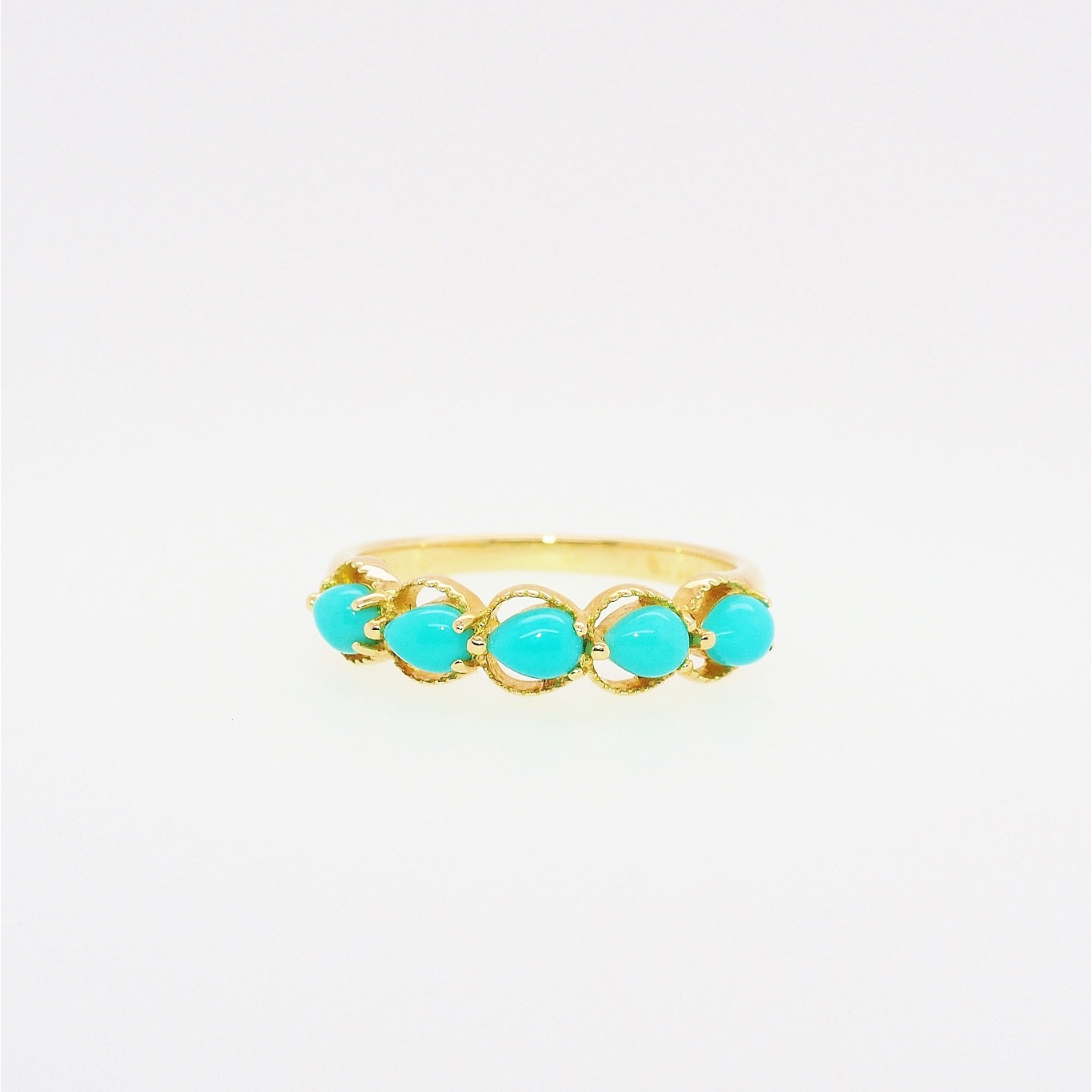 フリルのようなスカラップ模様でトルコ石を5石、一文字に並べた贅沢なリング。よく見るとトルコ石はペアシェイプカットをセットした可愛いリングです。スカラップはヨーロッパのフリルの縁取りのこと、ビーナスが海から乗ってやってきた帆立貝(スカロップ)から来ています。