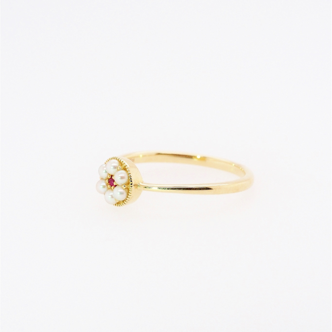 ルビーを中心にシードパールで取り囲んだ定番デザイン。アンティークスタイルらしいミル打ちが繊細なアクセント。