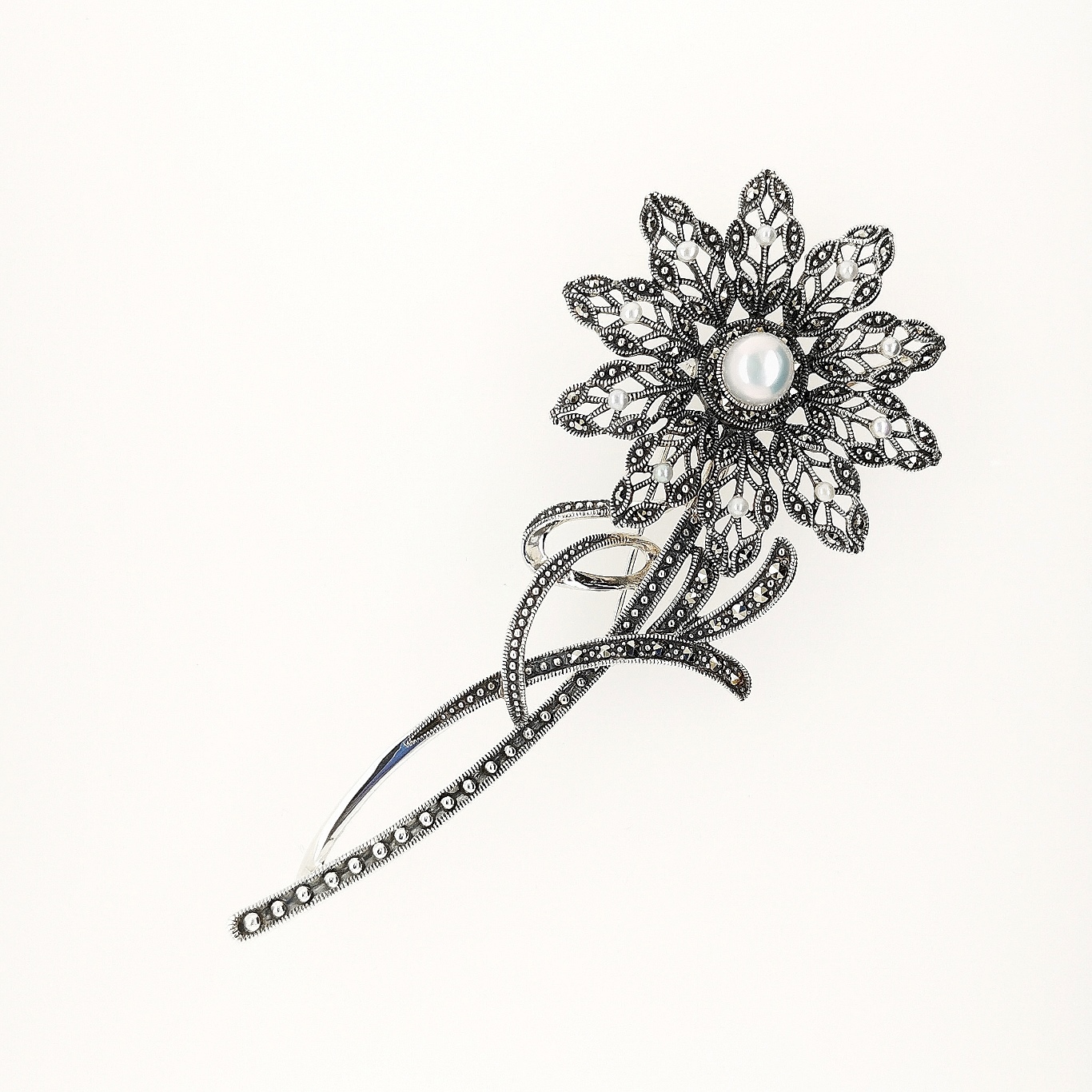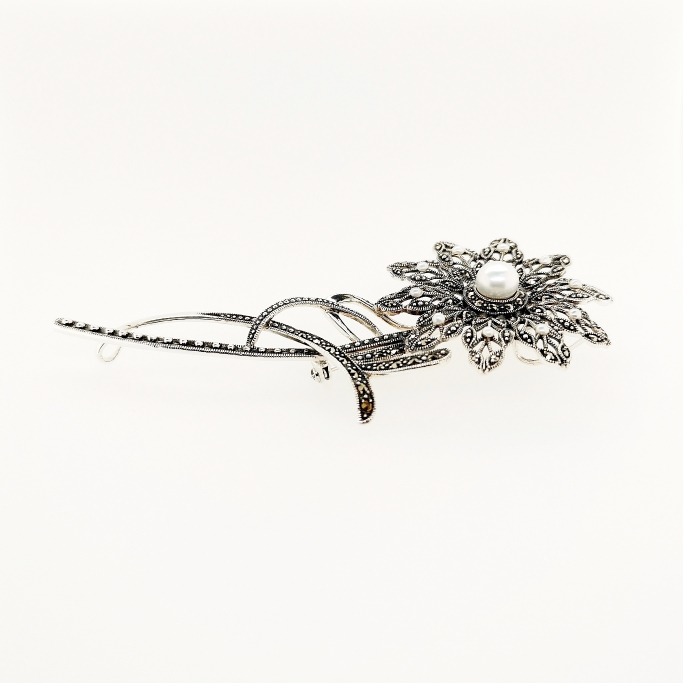 可憐なデイジーをモチーフにしたエレガントなブローチ/ペンダントヘッド。すっきりとしたフォルムでありながら細かなガーランドスタイルの葉のデザインが成されて繊細な仕事に目を奪われます。茎の部分には余分な装飾を取り払ってマルカジットの美しいライン運びで表現していますので花びらを引き立たせており緩急の美しさが魅力です。