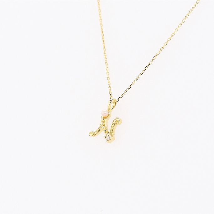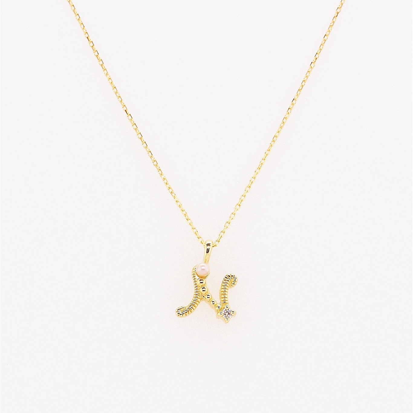 フリーハンドで書いたようなイニシャルがとっても可愛いペンダント。大切な人への贈り物にも人気です!アクセントにダイヤモンドとシードパールを留めて、仕上げはアンティークらしいミル打ちと小さな玉飾りで飾りました。 イニシャルはすべてのアルファベットのご用意がありますのでご希望の際はお問合せください。