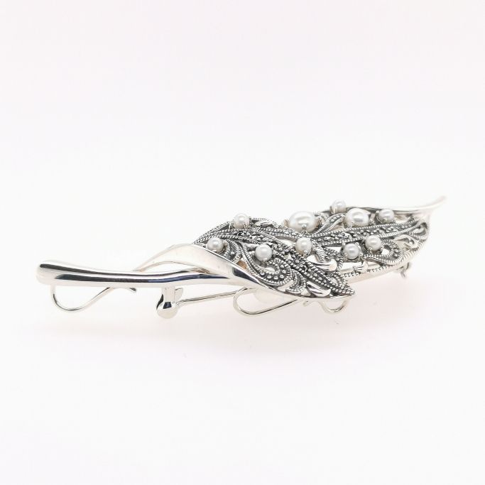 重なり合った葉の部分はアラベスク調の透かし模様にマルカジットを留めてきらめきをプラスしミル打ちを全体的に入れました。程よい大きさで着けやすく、カジュアルなスタイルから使っていただけます。襟元や胸元だけでなく、お帽子やバッグなど、様々な場所にお着け頂ける使い勝手の良い大きさが魅力です。
