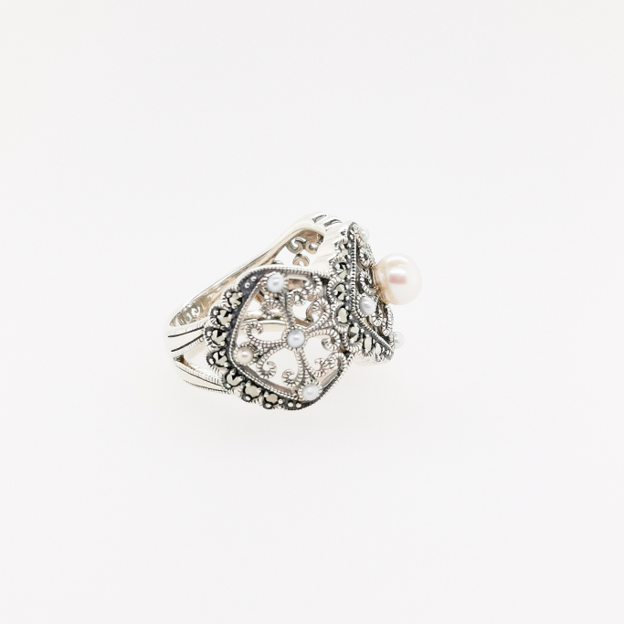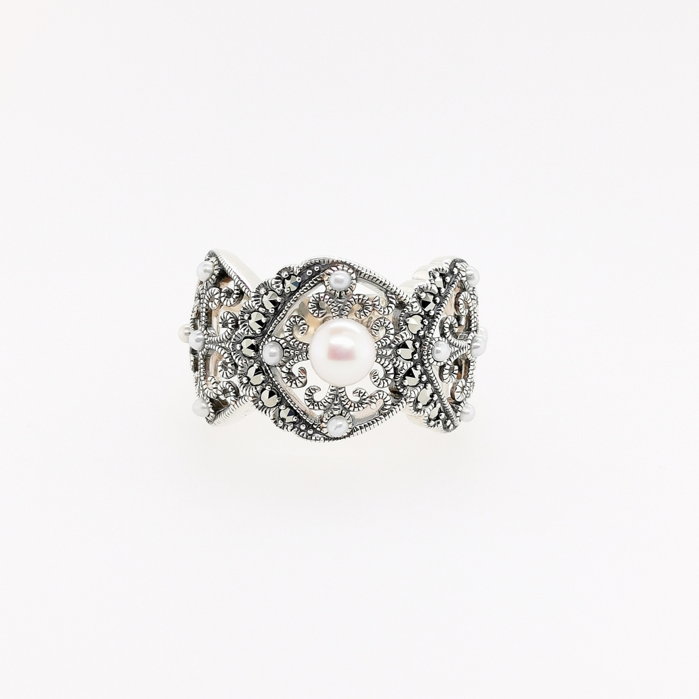 シルバーで編み上げたレースの様な繊細さにうっとりしつつ、実はたっぷりとしたボリュームも兼ね備えた贅沢リングです。指がほっそり見えることで人気の幅広のデザインも、レーシーな仕上げで軽やかさを取り入れ、フェミニンな印象を与えることに成功しました。カジュアルに普段からさり気なくもおつけいただけますし、ドレッシーなファッションや場面でもお楽しみ頂ける、活用頻度の高さが期待できるリングです。